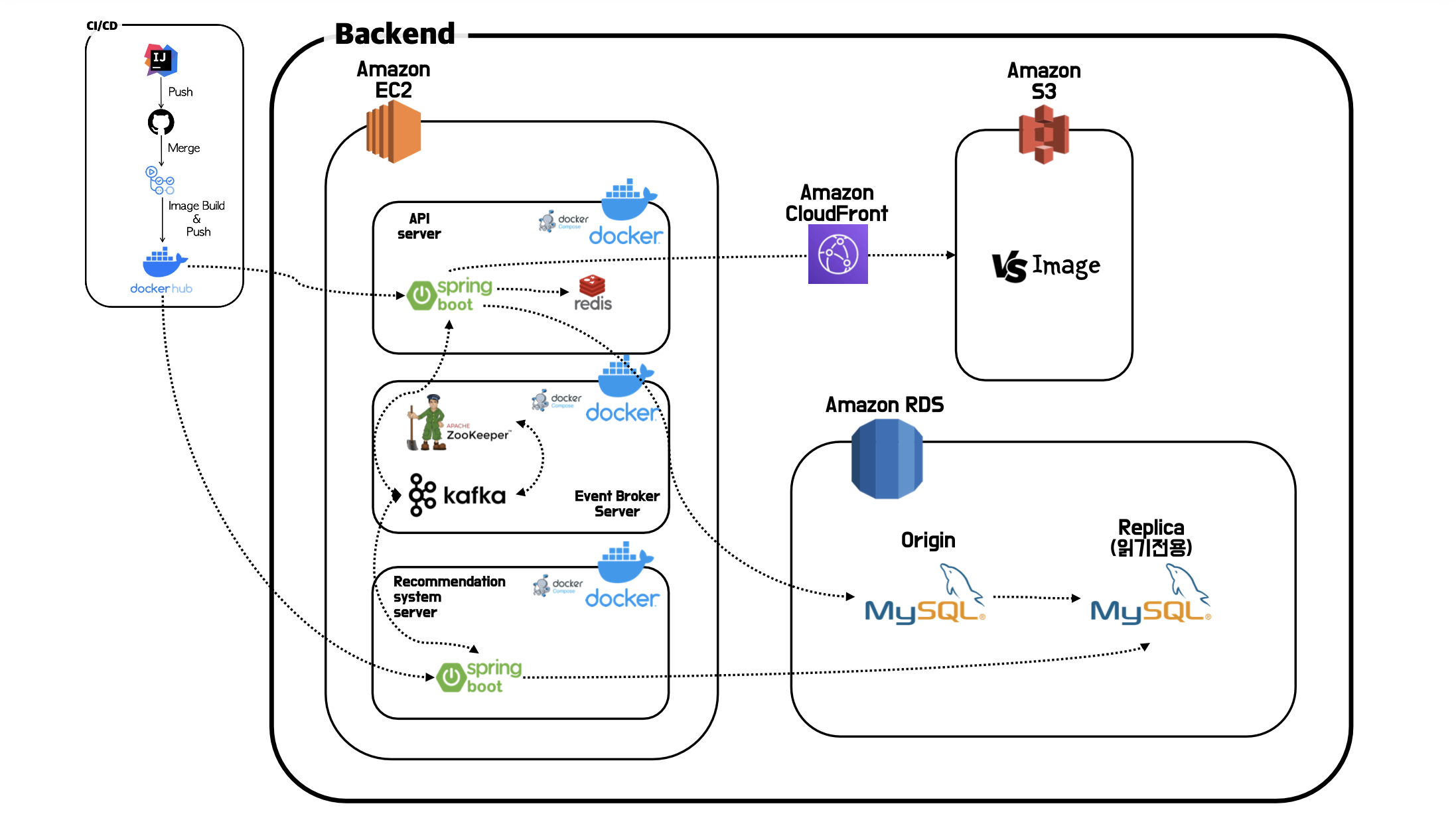 API 서버와 추천 시스템 서버는 따라 깃허브 액션을 통해 도커 이미지로 만들어지고, 도커 허브에 push 된다. 이후, EC2 SSH에 접근, 도커 허브에서 갱신된 이미지를 pull 한다. 이는 도커 컴포즈를 활용해서 실행했다.