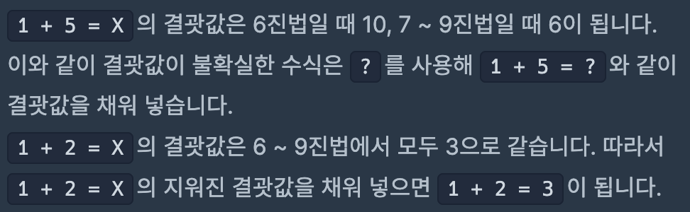 // 덧셈에서 추정한 진수로 결과를 계산하고, 올림이 발생하면 '?'로 표시