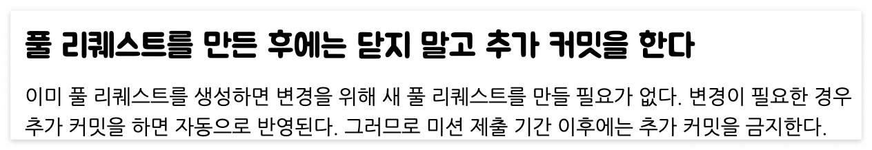 리뷰를 받으며, 풀 리퀘스트를 올린채로 코드 수정 후 커밋을 진행했는데 앞으로는 별도의 리포지토리에 포크해서 진행해야겠다.