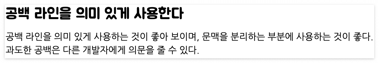 그 습관이 무섭게도, 코드 작성에서도 자주 공백 라인을 사용하는데 좋은 예시 코드들을 찾으며 신경 써봐야겠다.
