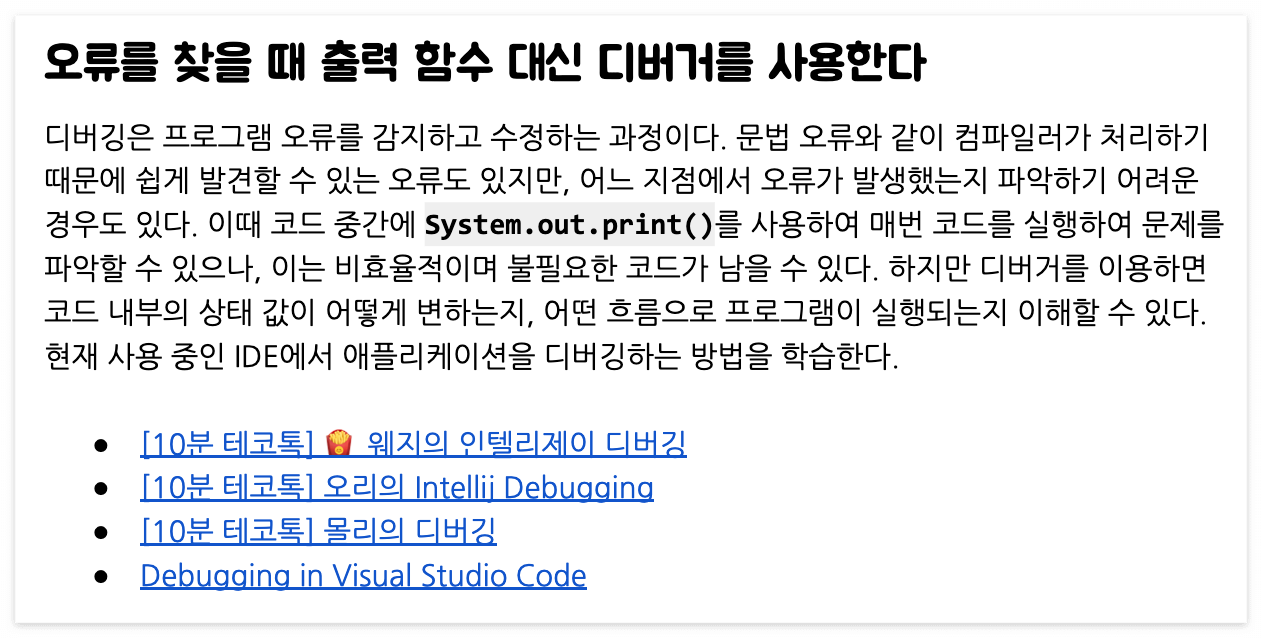 오류를 찾을 때 디버거를 추천해주신다. 평소 출력 함수와 디버거를 혼용해 왔는데 디버거 사용에 초점을 맞춰야겠다.