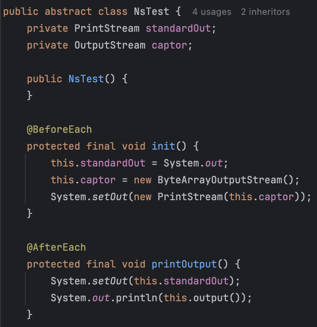 NsTest 상속을 제거하고, System.setIn(), setOut()을 활용하여 입력 스트림을 직접 설정하는 방법을 참고할 수도 있다.