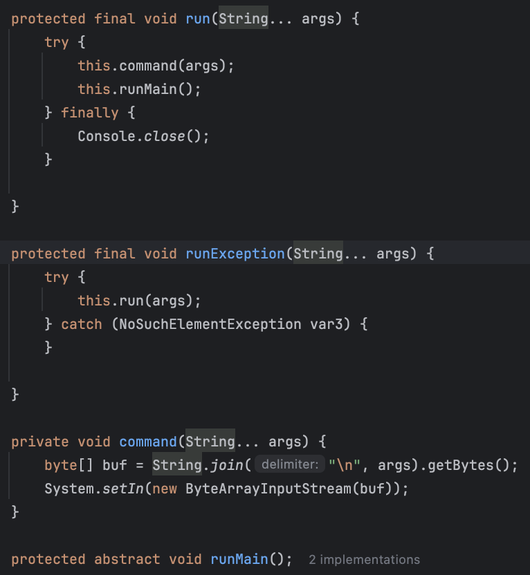 정확히는 run에서 전달된 args를 System.in에 설정하여 프로그램이 이를 입력으로 사용할 수 있게 만든다.