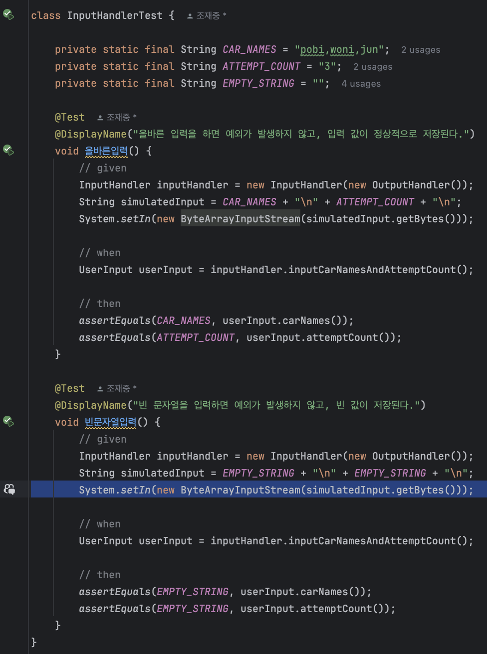 추상적으로만 생각했을 때, 단순히 실패하는 테스트 케이스를 작성하고, 그 테스트가 통과하도록 코드를 작성한 후, 리팩토링하면 된다고 생각했다. 하지만 실제로는 그 과정이 훨씬 더 복잡했다. 테스트 케이스를 어떻게 작성해야 할지도 감이 잘 오지 않았고, 무엇보다 테스트가 서로 의존적이지 않게 구성하는 방법에 대해서도 막막했다. 특히 이번 과제는 표준 입력을 다루는 특성상, 이를 테스트하는 방법이 쉽지 않았다.