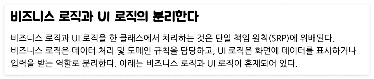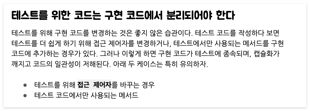 중요도가 높은 private 함수를 분리해 테스트 가능성을 높였고, 코드의 응집도와 테스트 효율성도 개선되었다. 단일 책임이라는 키워드는 추상적으로는 이해가 되지만 완벽히 적용하기 참 어려운 것 같다.