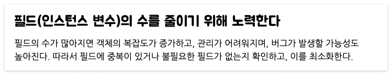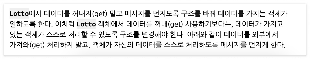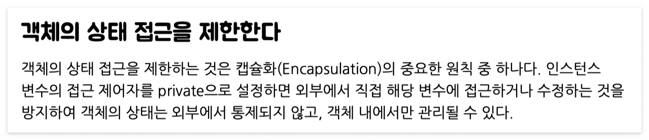 인스턴스 변수를 private으로 설정해 불필요한 변경을 방지했다. 더 나은 캡슐화를 위해, 객체의 상태를 직접 변경하기보다는 객체 스스로가 자신의 메서드를 통해 상태를 변경하도록 연습 중이다. 이를 위해 getter 사용을 줄이고 객체의 책임을 강화하려 노력하고 있다.