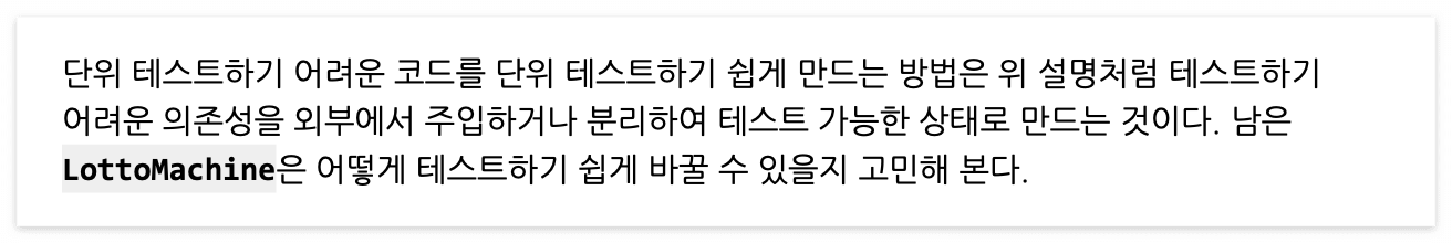 Random과 같은 의존성을 외부로 분리하면서 테스트가 수월해졌고 코드 구조도 개선되었다.