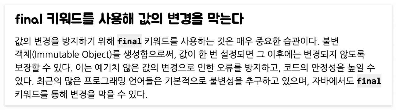 1주 차 공통 피드백 영상에서 final 키워드를 필드뿐만 아니라 메서드 시그니처의 매개변수에 사용하는 것이 인상 깊어서 기억이 난다. final 키워드로 불변임을 명시적으로 표현하는 것이 코드의 안정성을 높이는 데 중요하다는 점을 다시금 되뇐다.
