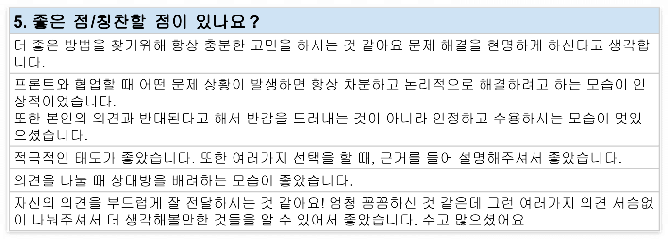 협업에서 기술적인 하드 스킬만큼 소프트 스킬이 중요하다는 점을 다시금 강조하고 싶다. 의견을 솔직하고 분명하게 전달하면서도, 상대방을 존중하고 배려하는 태도는 기본이었다. 팀원들로부터 이에 대한 피드백을 받았을 때, 나의 접근 방식이 긍정적인 영향을 미쳤음을 느낄 수 있어 더욱 의미 있었다.