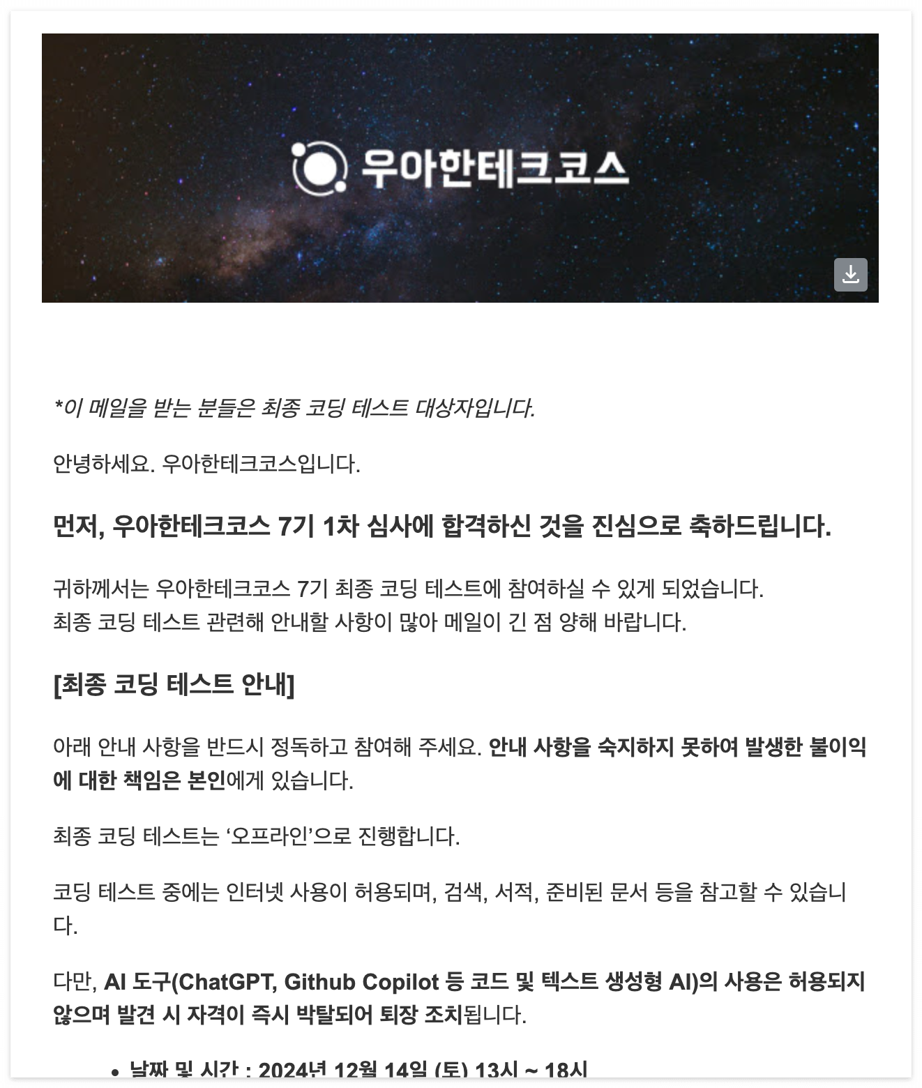 최종 코딩 테스트는 14일로 예정되어 있었다. 하지만 데브코스 최종 프로젝트 마무리와 13일 수료식이 겹치면서 준비할 시간을 충분히 확보할 수 없었다. 더군다나, 최근 스프링 프레임워크 플로우에 익숙해진 터라 순수 자바 기반으로 진행되는 코딩 테스트가 부담스럽기도 했다.