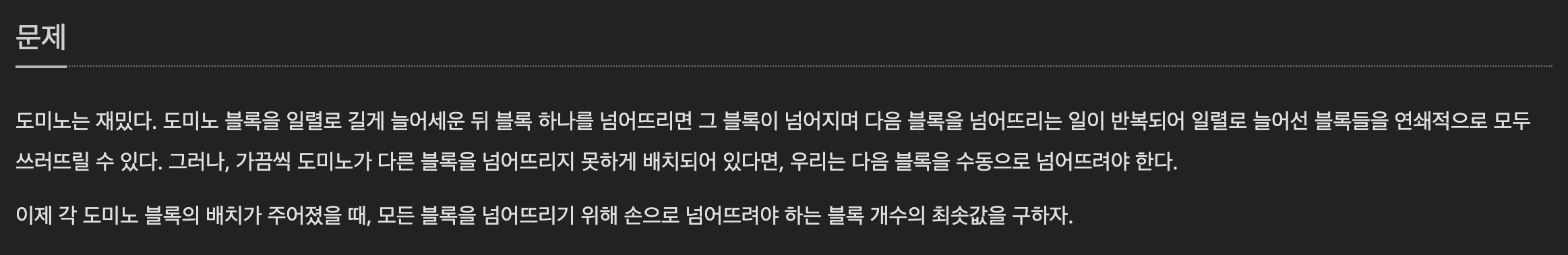 최소 몇 개의 도미노를 직접 넘어뜨려야 하는지를 계산