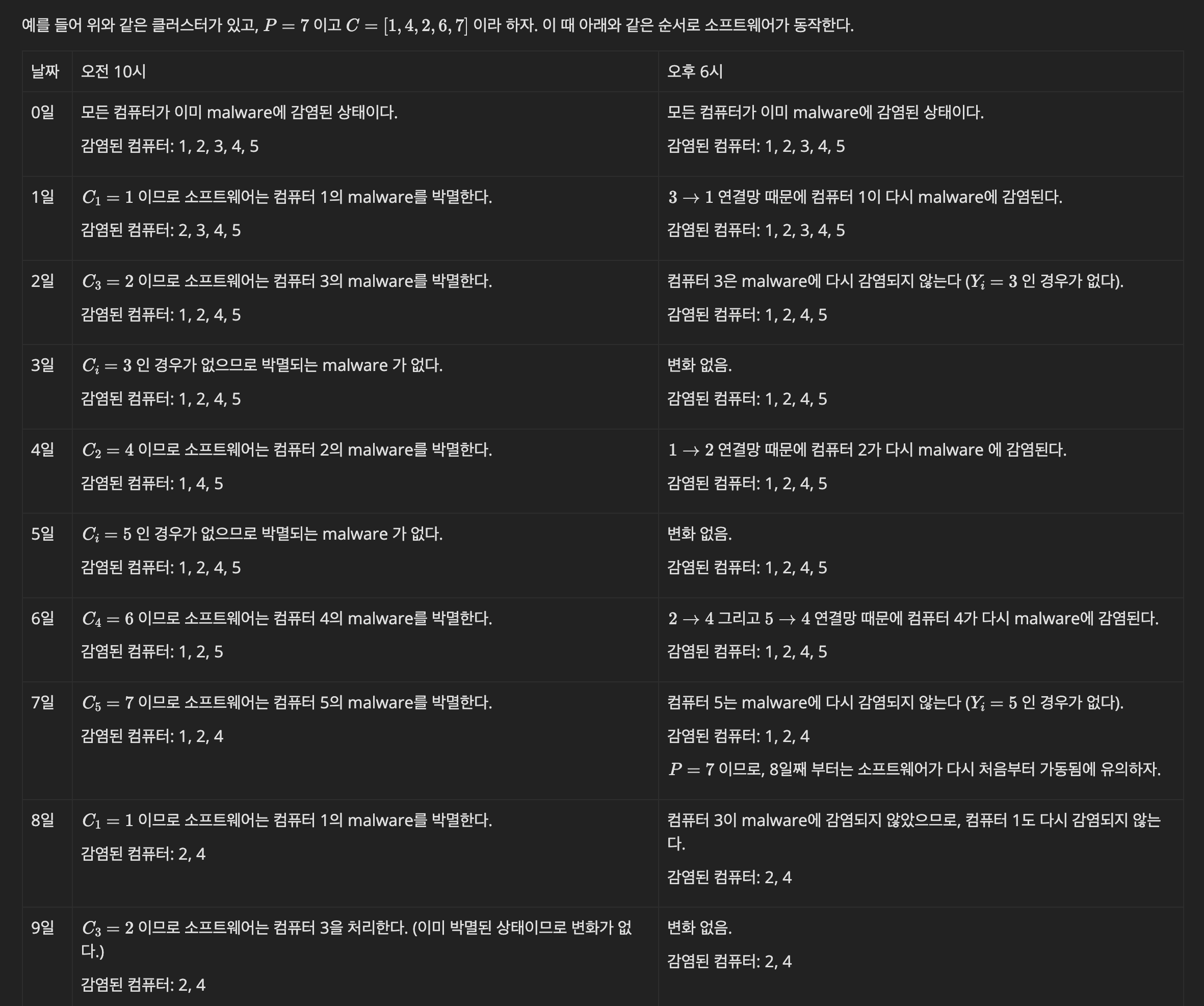 문제의 핵심은 현재 박멸이 진행되는 컴퓨터(노드)에 진입하는 간선(즉, 외부에서 감염될 가능성)이 있다면, 해당 컴퓨터는 다시 감염될 수 있어 즉시 처리할 수 없다는 점이다.