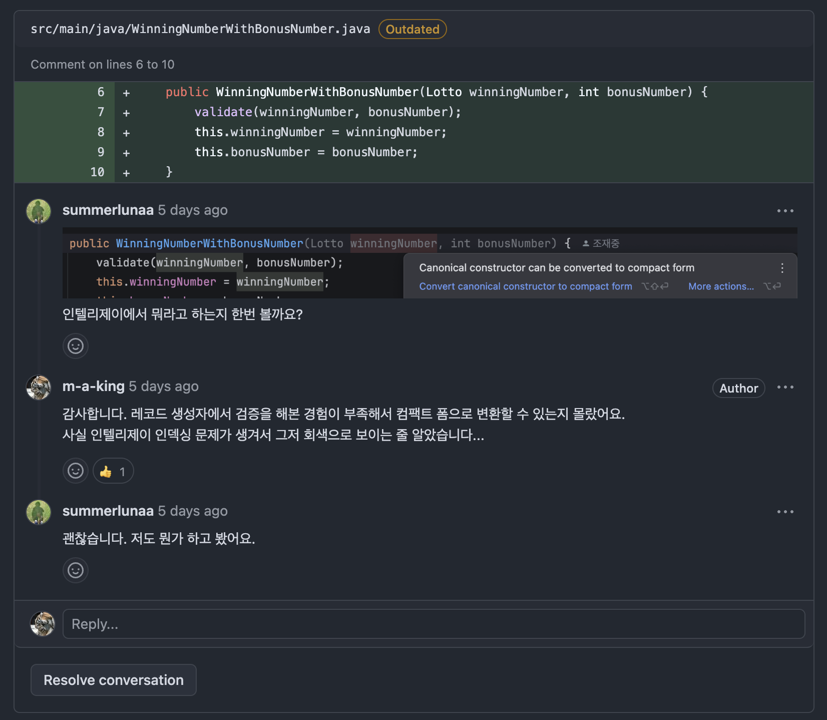 이 설계에 대해 크루와 논의하는 과정에서 이대로는 로또 객체가 너무 수동적인 존재가 되는 것이 아닌가? 라는 피드백을 받았다.