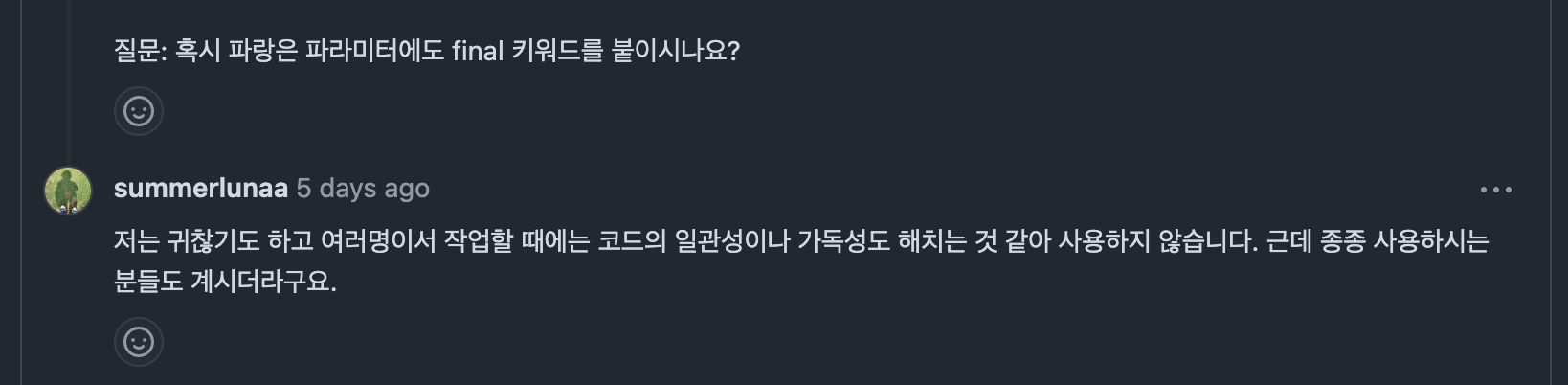 모든 변수에 final 키워드를 붙이고 불변하지 않은 변수에서 final 키워드를 삭제하는 일반적인 사고의 반하는 스타일, 뭔가 멋졌다.