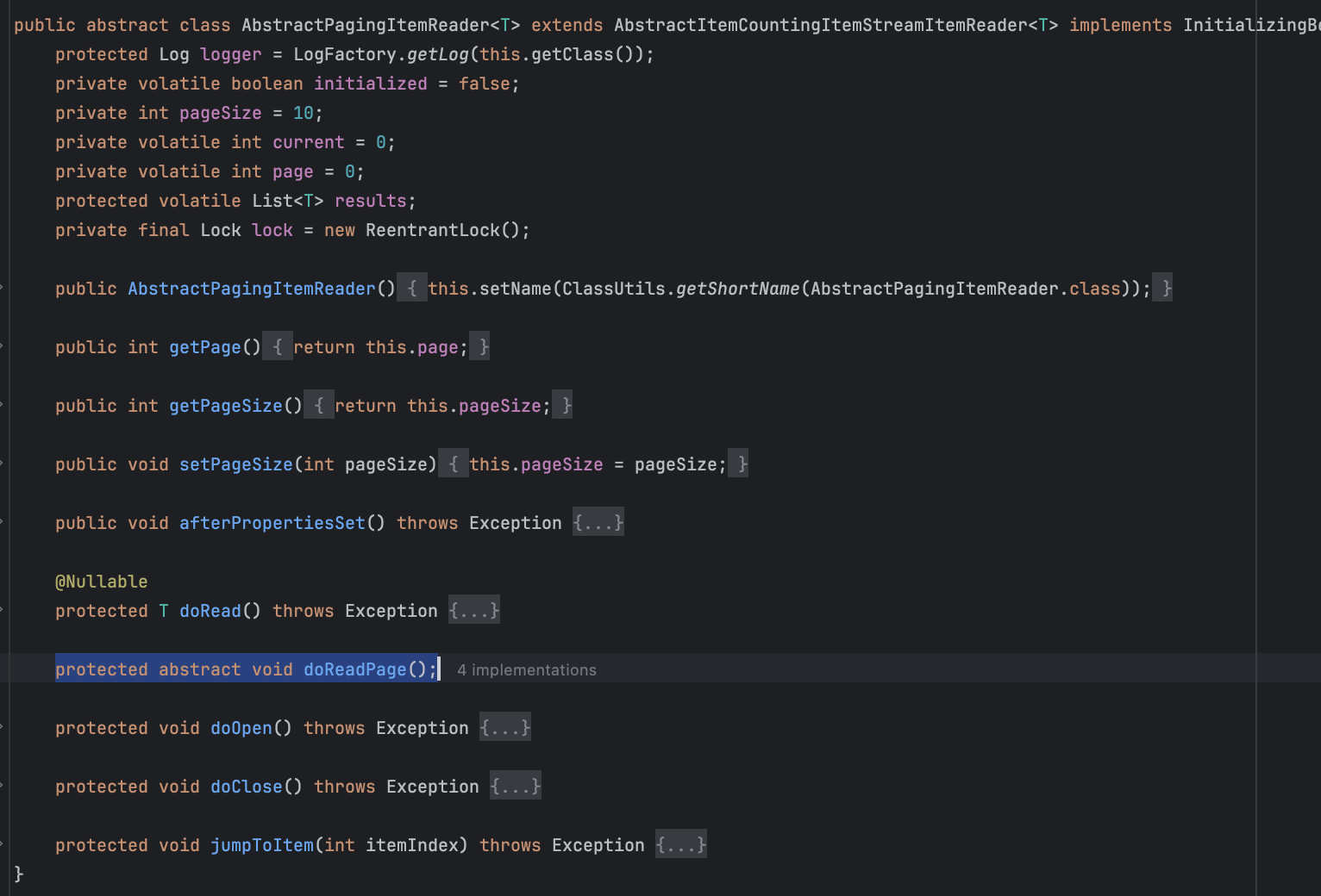 AbstractPagingItemReader 클래스, abstract method doReadPage가 보입니다. createQuery는 보이지 않네요.
