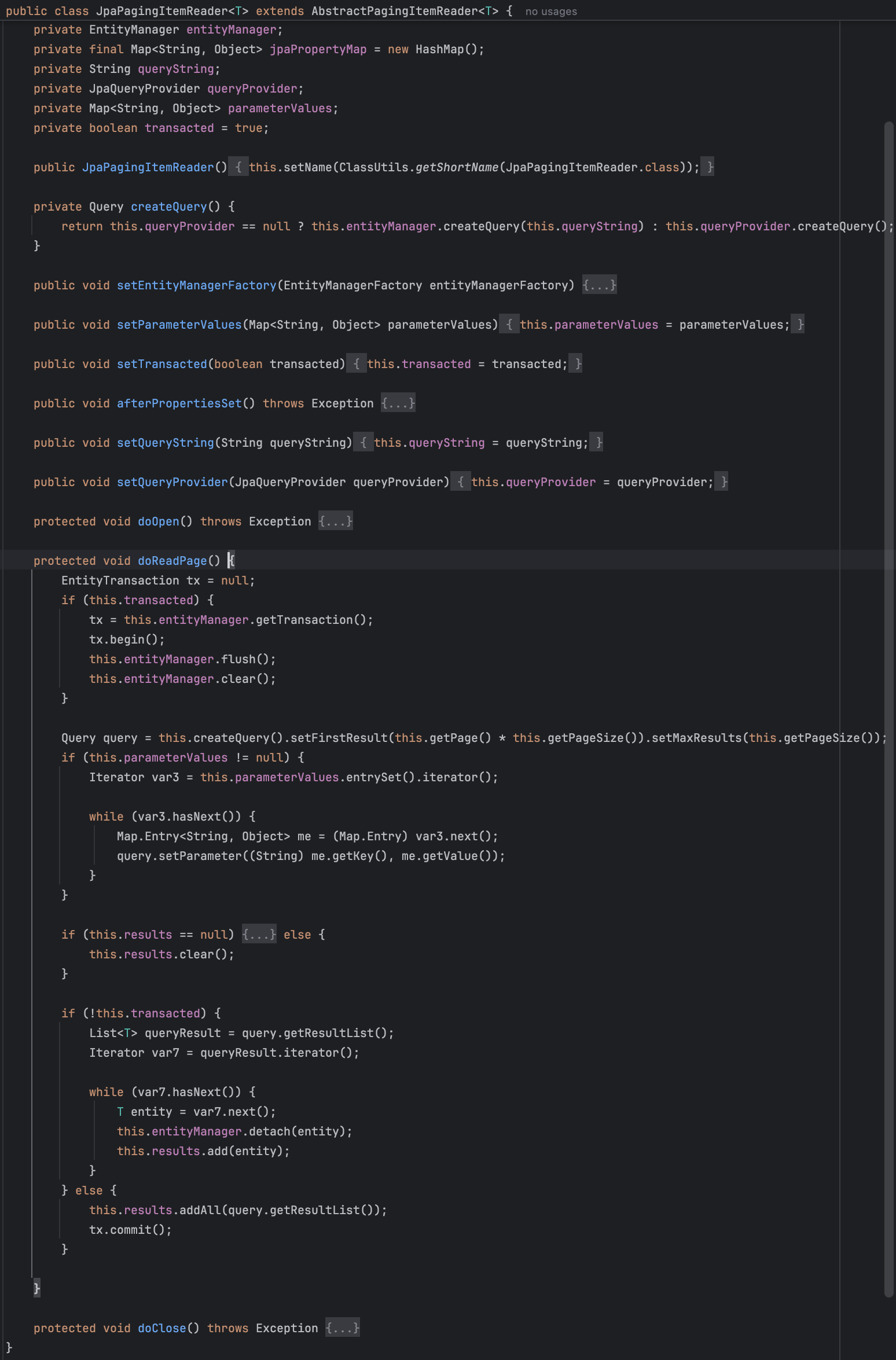 아래 코드에서, AbstractPagingItemReader를 상속받은 JpaPagingItemReader를 확인해보면, createQuery와 그를 호출하는 doReadPage를 확인할 수 있습니다.